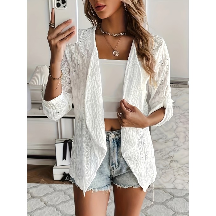 Solid Eyelet Open Front Blazer, Casual Lapel Long Sleeve Outwear For Spring & Fall, Women's Clothing Solid Eyelet Open Front Blazer, Casual Lapel Long Sleeve Outwear For Spring & Fall, Women's Clothing