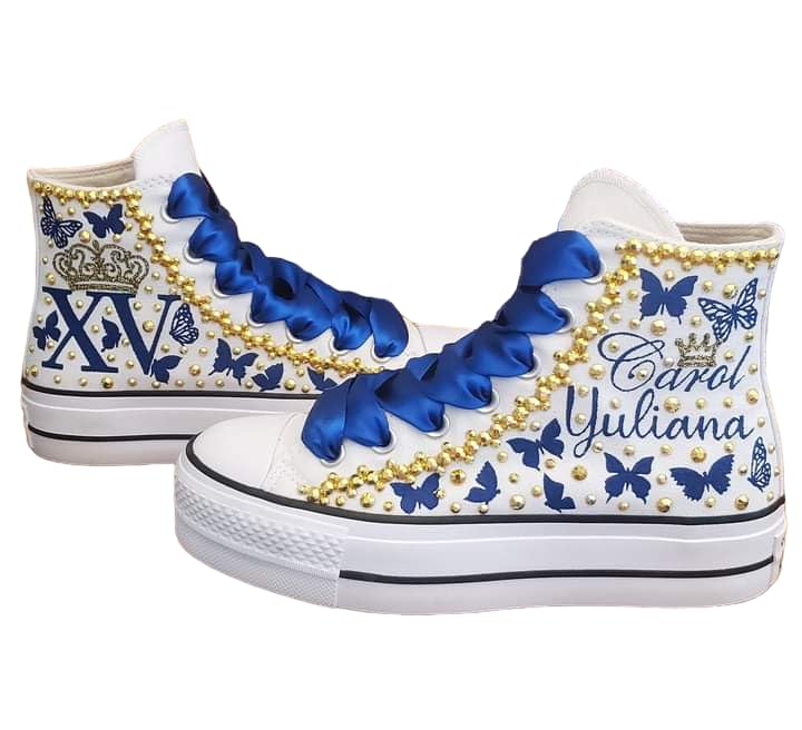 Fifteen Birthday Custom Shoes, Quinceanera Sneakers Buterflies Printed, Mis XV Shoes high top Blue