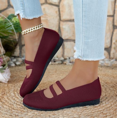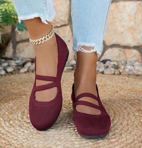 Knit Flats for Women Square Toe Ankle Strap Casual Ballet Flats Mary Jane Shoes Women Comfortable for Dressy Office