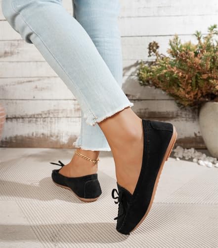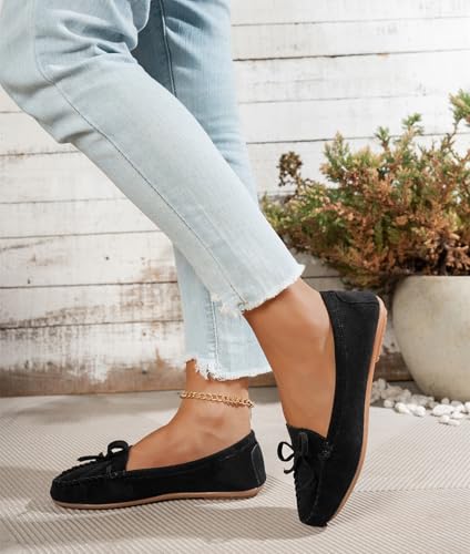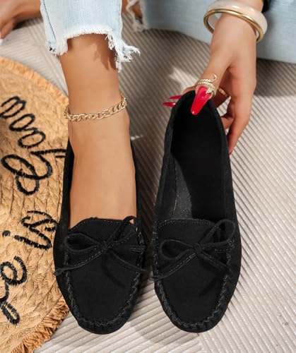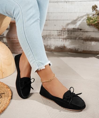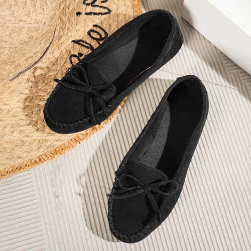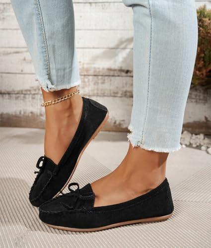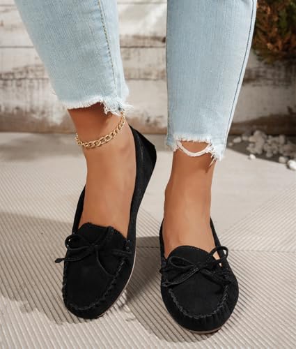 Women's Comfortable Suede Penny Loafers Casual Round Toe Slip On Bowknot Lightweight Walking Flats Moccasins Driving Boat Shoes
