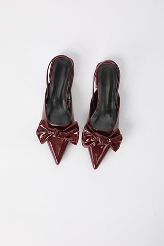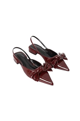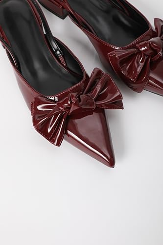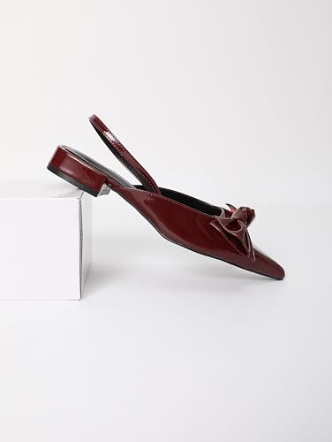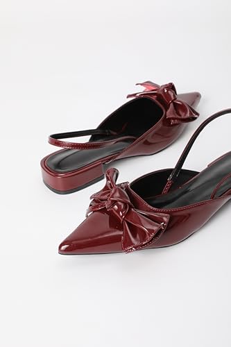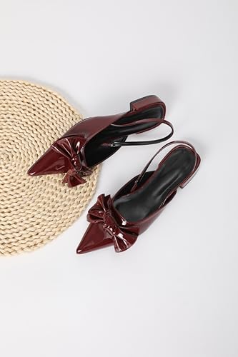 Women's Patent Leather Pointed Toe Slingback Flats with Bow, Burgundy