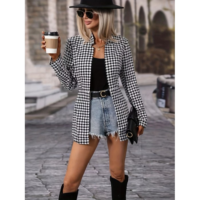 Elegant Houndstooth Print Open Front Blazer for Women - Stylish Long Sleeve Work Office Outerwear